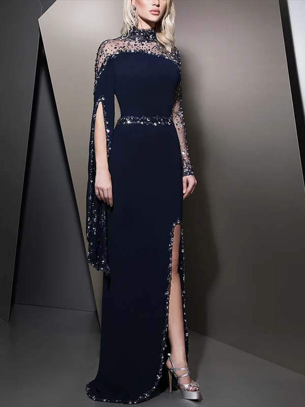 Long Sleeve Beaded Formal Evening Dress Floral High Neck