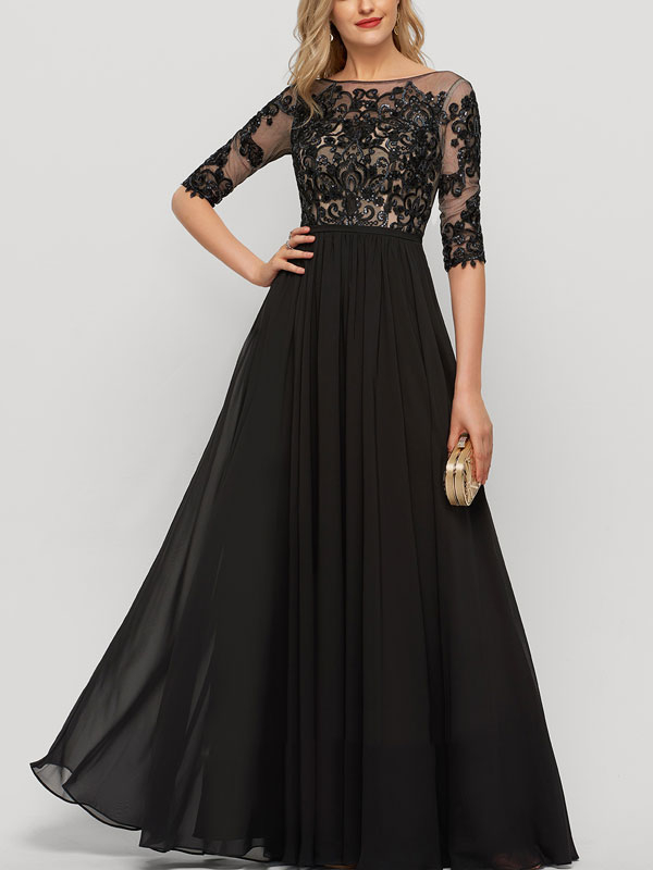 A-Line High Neck Floor-Length Chiffon Lace Evening Dress